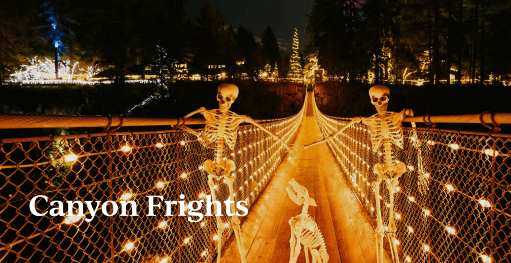 Canyon Frights, the suspension bridge and forest glow with eerie lights. Families and couples enjoy this magical, not-too-scary Halloween activity in Vancouver.