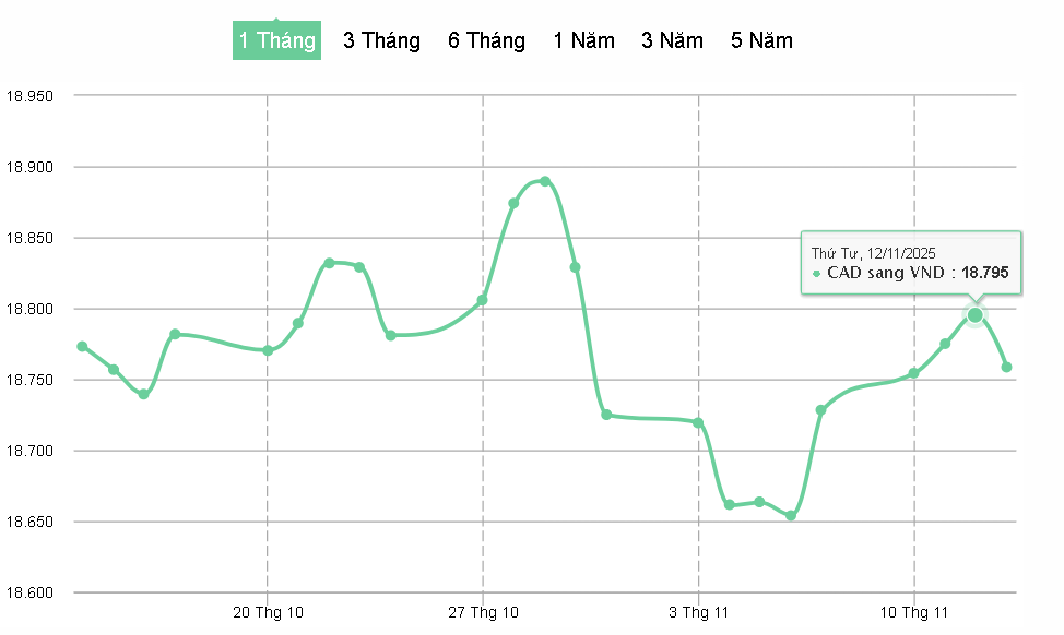👉 Vào lúc 11:00 AM (EST) ngày 12/11/2025. Tỷ giá Smiles là 1 CAD = 18,710 VND, cao hơn mức trung bình so với các bên khác.