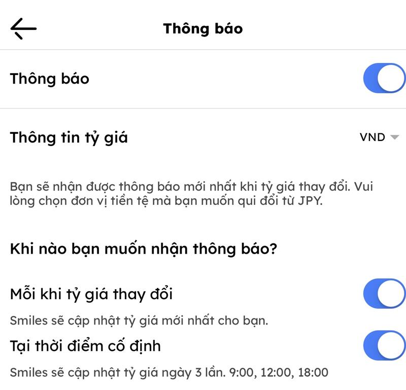 Ứng dụng chuyển tiền Smiles cho phép bạn nhận “Thông báo tỷ giá tự động” – khi có thay đổi về tỷ giá hoặc vào các khung giờ cố định trong ngày, giúp bạn luôn cập nhật tỷ giá kịp thời để chuyển tiền lúc tỷ giá tốt nhất!