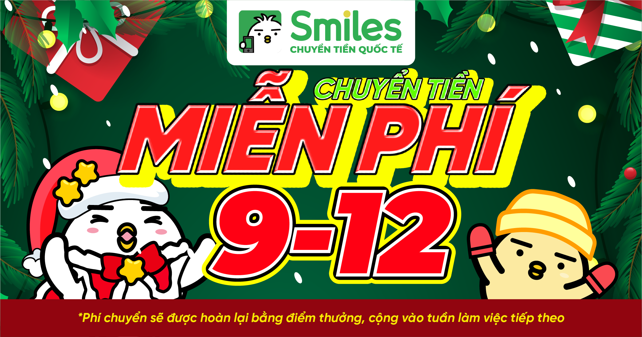 Những ngày cuối năm bận rộn, việc gửi tiền về quê càng trở nên ý nghĩa hơn. Ngày 09/12, Smiles mang đến ưu đãi chuyển tiền miễn phí để bạn dễ dàng gửi trọn tình thân về Việt Nam – nhanh chóng, an toàn và tiện lợi.