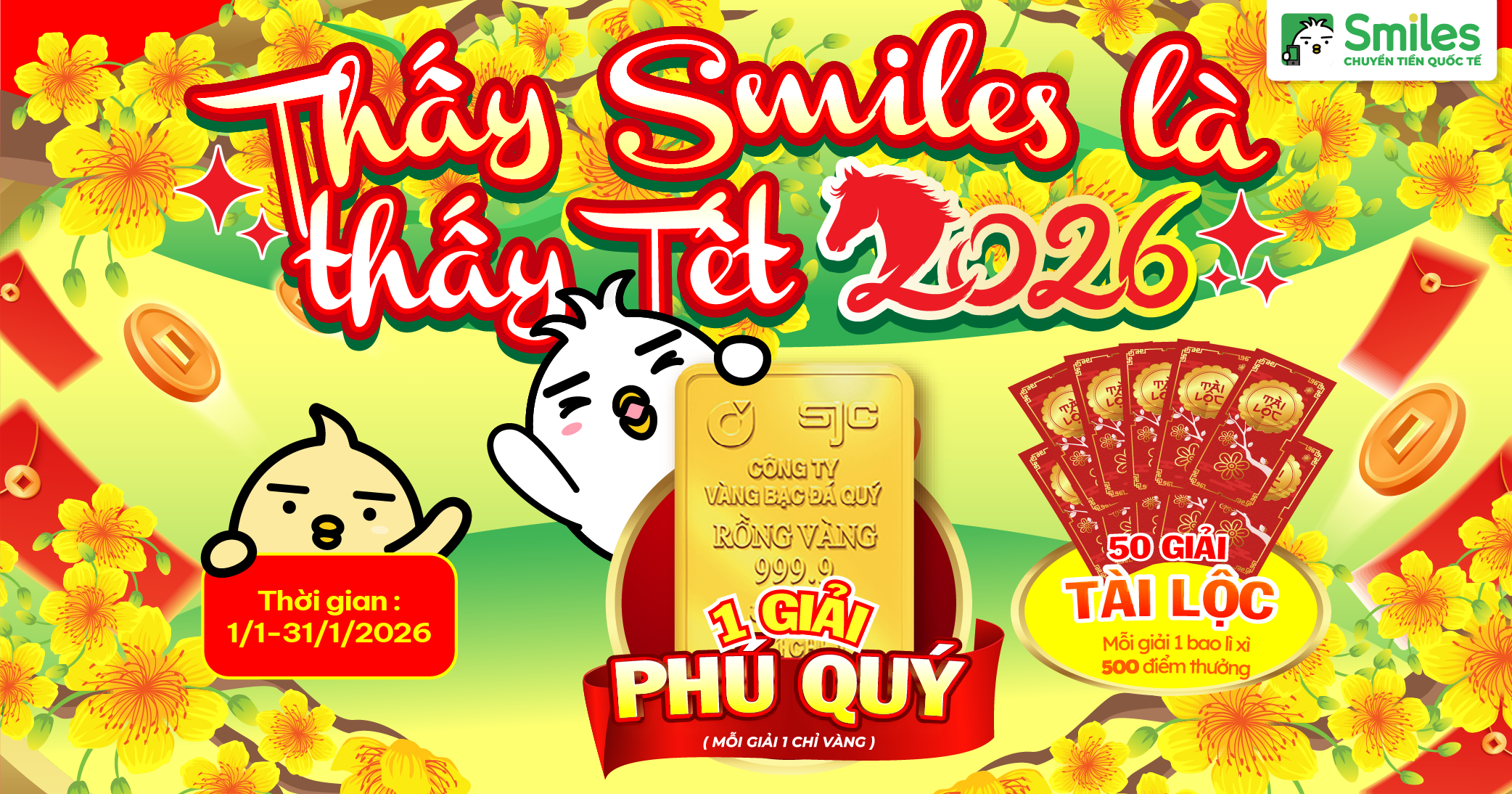 Xuân 2026 này, hãy cùng Smiles đón Tết trọn vẹn hơn với những phần quà mang đậm ý nghĩa sum vầy và tài lộc thông qua chương trình “Thấy Smiles là thấy Tết 2026”.