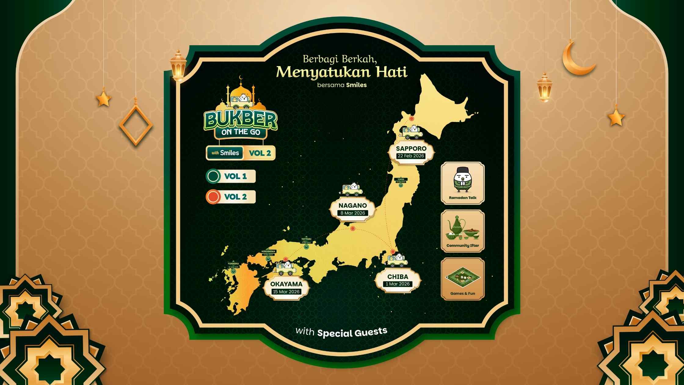 Setelah respon yang sangat positif dari Bukber On the Go pertama tahun lalu, tahun ini Smiles kembali mengadakan acara buka bersama dengan komunitas Indonesia di Jepang dari berbagai prefektur. Untuk tahun ini, Smiles akan mengunjungi Hokkaido, Chiba, Nagano, Okayama untuk mempererat tali silaturahmi bersama diaspora Indonesia dan bersatu bersama komunitas untuk berseru-seruan, dan berbagi momen kebersamaan yang penuh berkah.