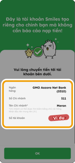 6. Bạn có thể nạp tiền từ bất kỳ ngân hàng nào vào tài khoản ngân hàng ảo này và tiền sẽ tự động được nạp vào Ví Smiles của bạn.