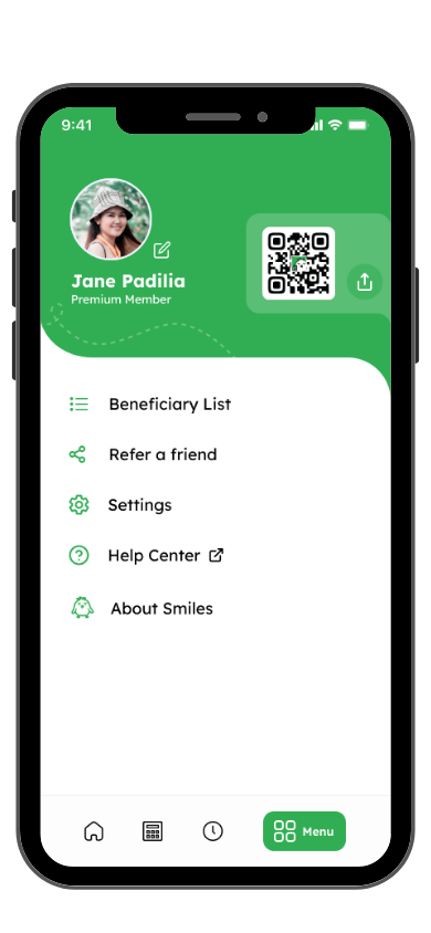Setiap pengguna Smiles akan menerima kode referal unik yang terdiri dari huruf dan angka. Kamu dapat menemukannya di tab “Menu” di dalam aplikasi.